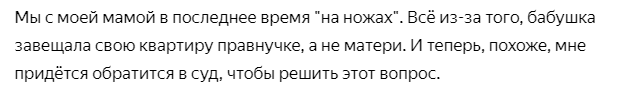 - Какая разница, кто бабушку дохаживал? Квартира по закону должна быть моя, - возмущается мама