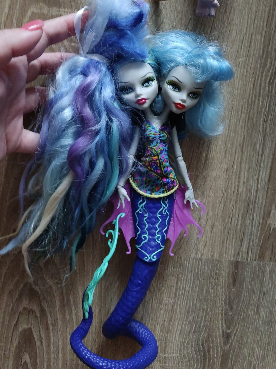 Всем привет! Меня зовут Александра, и я увлекаюсь преображением (ООАКом) кукол Monster High и Ever After High. Пока я занимаюсь аутфитом для Алисы, чтобы вы не скучали, расскажу о необычной прошивке, которую я успела сделать в промежутке между проектами. Прошивка делалась в подарок на день рождения моей подруге Маше. Остальные процессы переделки этой куклы будет делать она сама. Ну и самое интересное в этой прошивке - это локоны. Вот такой микс цветов, который Маша купила на распродаже у woolhobby. Цена была очень приятная, поэтому Маша купила 3 пучка по 50 гр разных цветов. Этой двухголовой красавице подошли синие оттенки, близкие к родным волосам. Прошить нужно было головы Гулий, которые были посажены на тело Пери и Перл. Видимо, родные головы, которые к слову очень красивы, когда-то пересадили на тела Гулий. Так что, куколка теперь в таком состоянии и нужно дать ей, точнее им, вторую жизнь. Разобрала локоны на две части: тёплую и холодную гамму. И когда разбирала, поняла всю с
