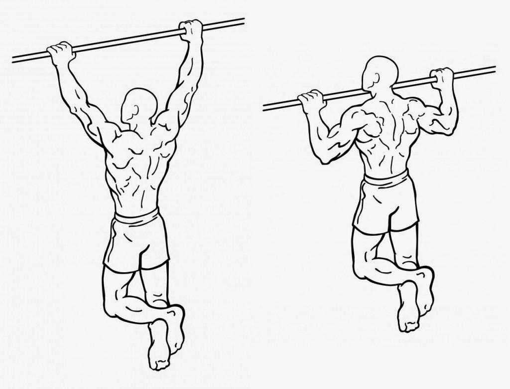 Наиболее эффективно мышцы спины развивают подтягивания средним прямым хватом. Возьмитесь за перекладину хватом, равным ширине плеч. Повисните, прогнув спину и скрестив ноги. Нужно подтягиваться, сводя лопатки и стараясь