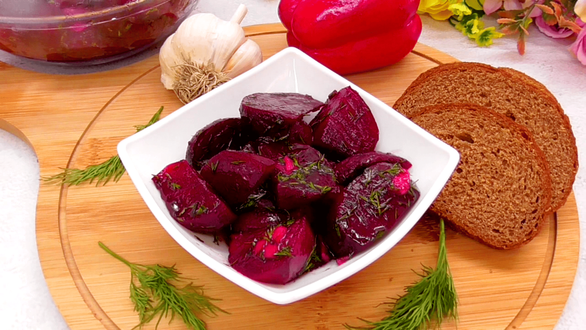 Если вы любите свеклу, то этот рецепт должен вам понравиться. Делается просто, быстро, а получается очень вкусно. Закуска отлично идет ко многим блюдам и идеально вписывается в будничное меню. Особенно хорошо у меня такая маринованная свекла идет в холодное время года — стала делать ее часто, почти каждую неделю. 🔹Ингредиенты: 🔹 ✔Свекла — у меня 630 г (в неочищенном виде). ✔Масло раст. — 4 ст. ложки. ✔Лимонный сок — 2 ст. ложки. ✔Соль — по вкусу. ✔Перец черный — ¼ ч. ложки. ✔Чеснок — 1-2 зубчика. ✔Мед — 1 ч. л. ✔Зелень — любая, по вкусу (у меня только укроп). РЕЦЕПТ ПРИГОТОВЛЕНИЯ Свеклу нужно заранее отварить или запечь в духовке. Я обычно сразу ее режу на нужный размер кусочков и запекаю при 200 градусах 30-40 минут под фольгой. Если отвариваете в кожуре, то потом почистить и порезать на кусочки, примерно как на моем фото. Тут форма не важна, главное, чтобы кусочки были не слишком мелкими. Крупные тоже нежелательны — плохо промаринуются. Далее готовим маринад: в миску налить масло,