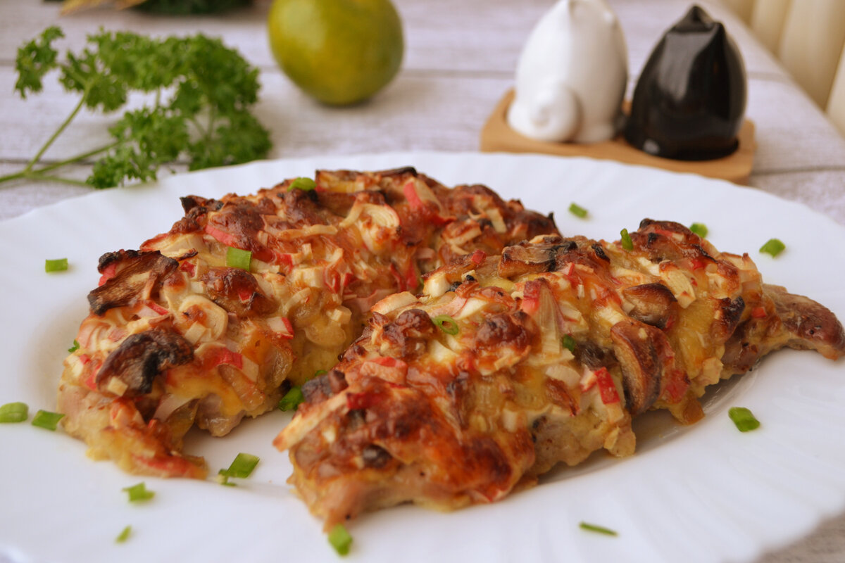 Понравился рецепт свинины с крабовыми палочками и грибами. Состав необычный, но это и правда очень вкусно. Рецепт на Новый год.