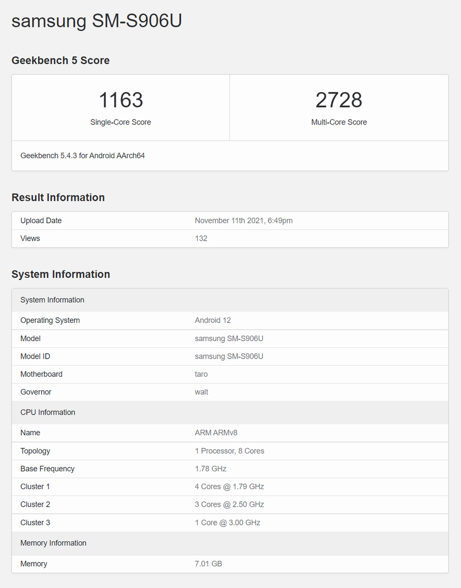 Samsung анонсирует смартфоны серии Galaxy S22 в феврале. По информации будут показаны три линейки телефона, такие как Galaxy S22, S22+ и S22 Ultra. Теперь версия Plus S22 появилась на Geekbench с некоторыми из ее ключевых спецификаций. Основываясь на информацию, можно сказать, что телефон Samsung с номером модели SM-S906U будет показан как Galaxy S22+. На Geekbench 5 появился S22+ с предстоящим флагманским чипом Qualcomm. Чтоже будет внутри устройства: - четырьмя процессорными ядрами, работающими на частоте 1,79 ГГц - тремя процессорными ядрами с тактовой частотой 2,50 ГГц - одним процессорным ядром, работающим на частоте 3,00 ГГц Список Geekbench показывает, что он имеет 8 ГБ оперативной памяти и Android 12. В одноядерном тесте он набрал 1163 и 2728 баллов. Тот же телефон был замечен на Geekbench с предстоящим чипсетом Exynos 2200. Также было установлено, что он оснащен 8 ГБ оперативной памяти и Android 12. Недавняя утечка показала, что Galaxy S22, S22+ и S22 Ultra будут выпущены с м