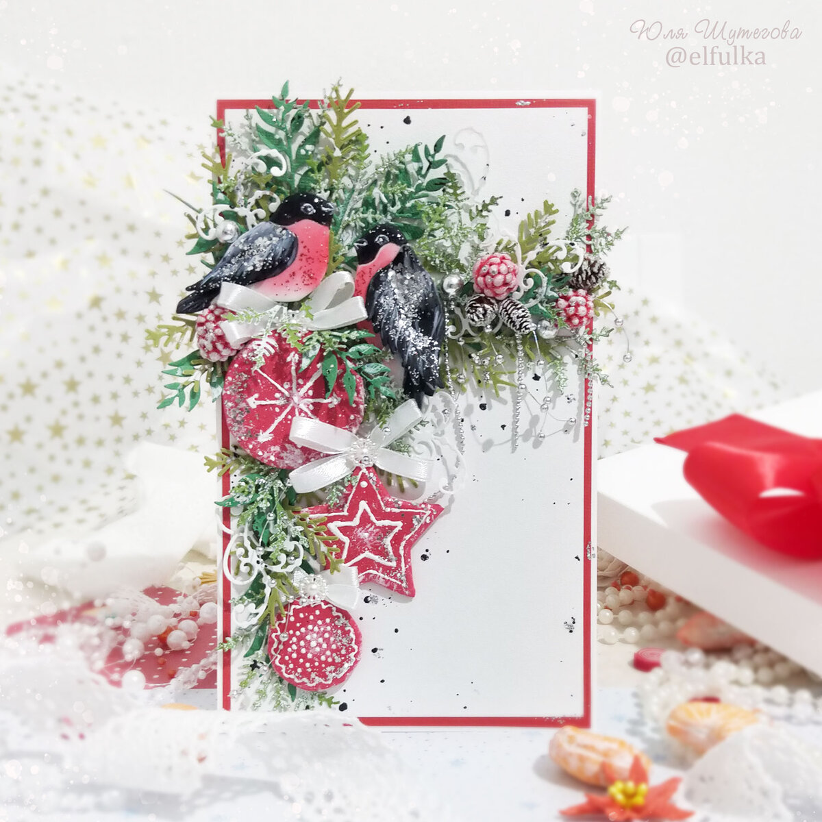Всем привет! Сегодня я к вам с новогодней открыткой, на которой так мило разместились яркие снегири. Размер открытки 20х12см. Основа выполнена из белого кардстока плотностью 200гр/м2. Основа которая оформлена красной и белоснежной дизайнерской бумагой. Открытка украшена большим количеством вырубных элементов, среди которых изящные веточки, листочки и декоративные завиточки. Зеленушки я дополнительно задекорировала красками, чтобы веточки и листики стали еще более интересными и живыми. Среди листвы спрятались миниатюрные заснеженные шишки и ягодки. Шишки настоящие (их я собирала в лесах Крайнего Севера), а ягодки делала с нуля из термо-клея. Так же среди зелени вы можете рассмотреть серебристые бусины на леске и миниатюрные жемчужные нити. Изюминки этой открытки - снегири и елочные шарики. Все они сделаны и окрашен вручную. Шарики дополнительно украшены миниатюрными бантиками из атласной ленты. А также в открытке присутствуют серебристые блестки для создания новогодней, волшебной атмос