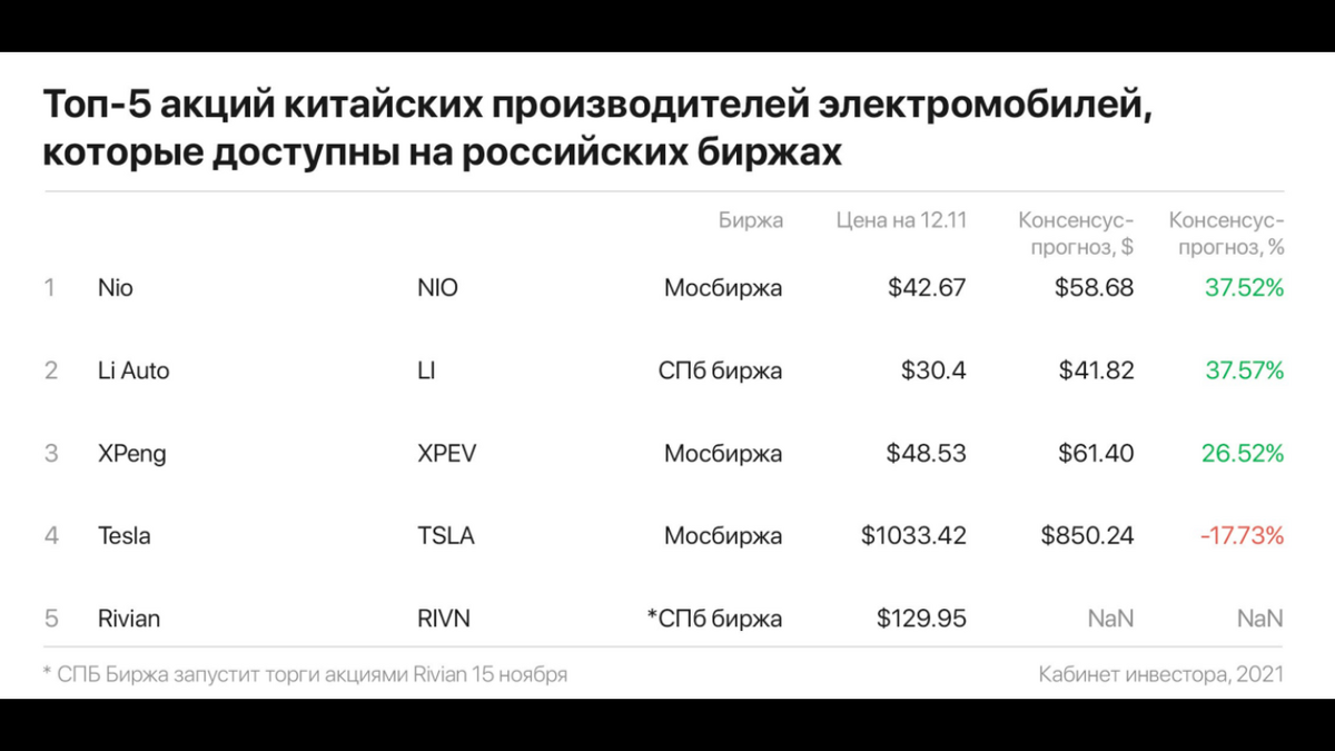 Приятно наблюдать, когда будущее наступает на глазах. Вроде недавно мы писали о перспективах в сегменте электромобилей, как расстановка сил уже поменялась, а за этим изменились и котировки лидирующих компаний. Что сейчас нужно знать о лидерах отрасли? Tesla ($TSLA). Илон Маск ходил «вокруг да около» продажи доли своих акций в твиттере. Не просто так — он уже продал бумаги Tesla на ~$5,74 млрд. Аналитики предвкушают падение цены до $850 за акцию. NIO ($NIO). Об этой замечательной компании я писал уже не раз. Наши прогнозы подтвердились — только за месяц её акции подорожали на 18%. Li auto ($LI). Автопроизводитель нарастил поставки кроссоверов Li ONE за октябрь на 107,2% в годовом выражении. Его успехи за месяц чуть скромнее — 5%. Xpeng ($XPEV). Закончим на очень позитивной ночи. Компания показала первое официальное изображение нового умного кроссовера XPeng G9. На этом фоне акции подскочили на 4%. Ждём новых рекордов. В таблице ниже я подготовили удобную сводку из топ-5 произв