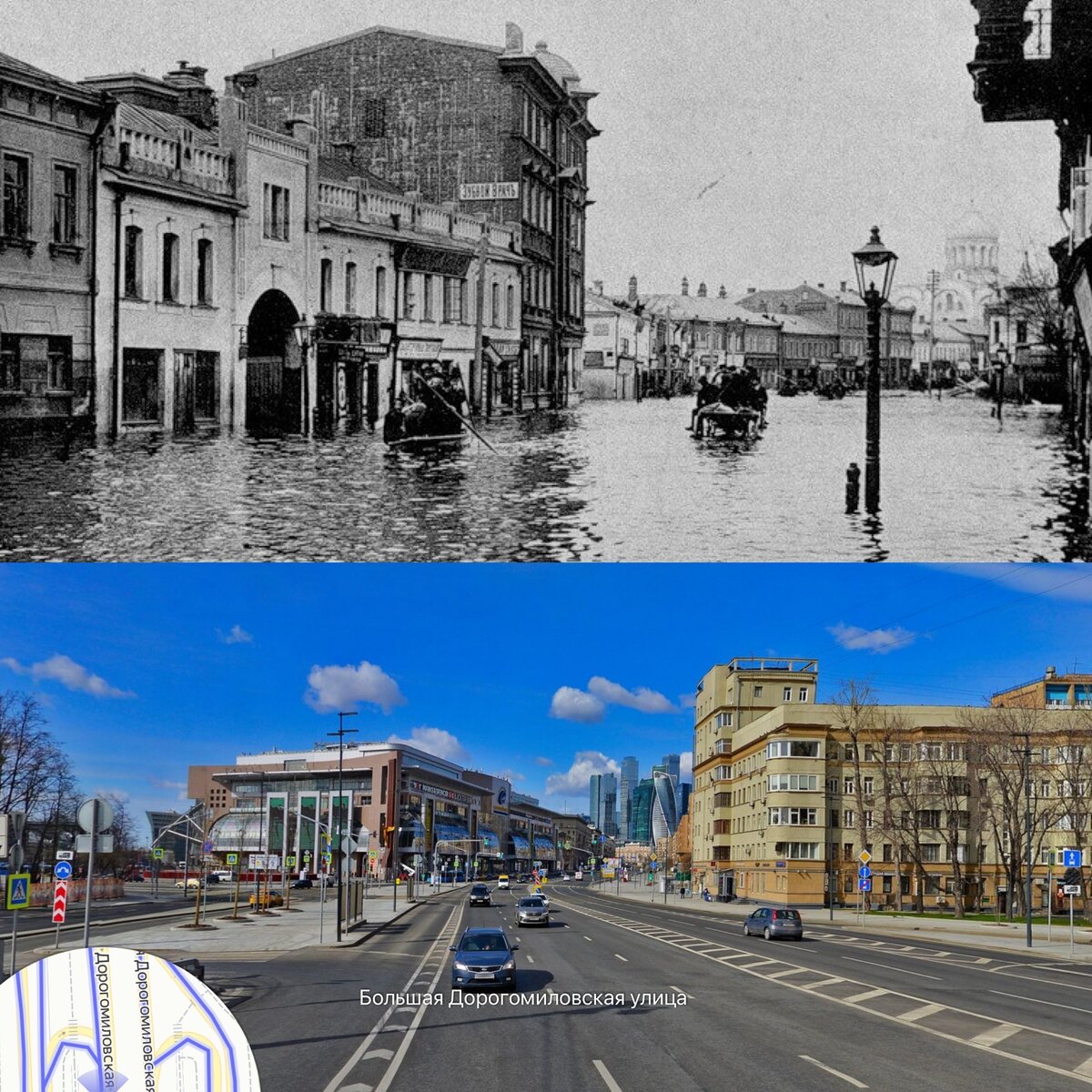 Очередная порция редких фотографий Москвы, совмещённых с современным ракурсом. Будем рассматривать снимки 1900-1930-х годов. Той столицы уже почти не осталось - она вся заменена новостройками или же отправлена на свалку истории... Большую Дорогомиловскую улицу при съезде с Бородинского моста не узнать. На снимке 1908 года запечатлено самое серьёзное наводнение за всю историю Москвы, когда улицы превратились в маленькую «Венецию». Вдалеке виден Богоявленский собор в Дорогомилове, второй по величине храм города после ХХС, но он будет сломан в 1938 году. Современный район пересечения улиц Новощукинской и Живописной прямо возле Москва-реки. Велосипедисты в деревне Щукино в 1903 году вызывают немалый интерес у крестьян. Тогда прогулки за город на новом виде транспорта были очень популярны, а велосипедистов в городе насчитывалось от 5 до 10 тысяч. Деревня Щукино войдёт в состав Москвы в 1940-х годах, но уже тогда рядом с ней строятся многочисленные дачи. Крестьяне носили горожанам зелень
