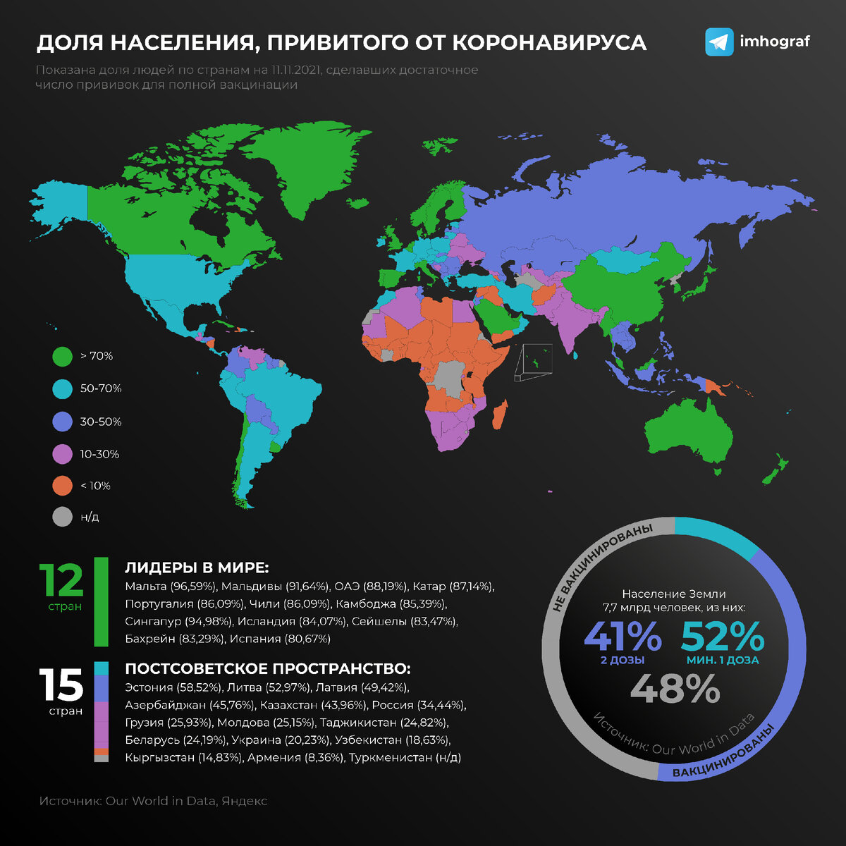 Инфографика по странам на 11 ноября 2021 года Инфографика периодически обновляется, это третье исправление. На 11 ноября в мире вакцинировано минимум одной дозой около 52% населения — это почти 4 млрд человек. В лидеры в этот раз выделено 12 стран, в которых процент вакцинированного населения выше 80%: 🇲🇹 Мальта — 96,59% 🇲🇻 Мальдивы — 91,64% 🇦🇪 ОАЭ — 88,19% 🇶🇦 Катар — 87,14% 🇵🇹 Португалия — 86,09% 🇨🇱 Чили — 86,09% 🇰🇭 Камбоджа — 85,39% 🇸🇬 Сингапур — 94,98% 🇮🇸 Исландия — 84,07% 🇸🇨 Сейшелы — 83,47% 🇧🇭 Бахрейн — 83,29% 🇪🇸 Испания — 80,67% При этом в числе постсоветских стран по прежнему нет таких, где вакцинировано больше 70% населения. Выше всех находятся прибалтийские страны (🇪🇪Эстония — 58,52%), а 🇷🇺Россия по процентному соотношению занимает только 6 место из 15-ти. При этом по количеству вакцинированных людей Россия находится на 1 месте на постсоветском пространстве и на 11 месте в мире с более чем 50 млн вакцинированных.