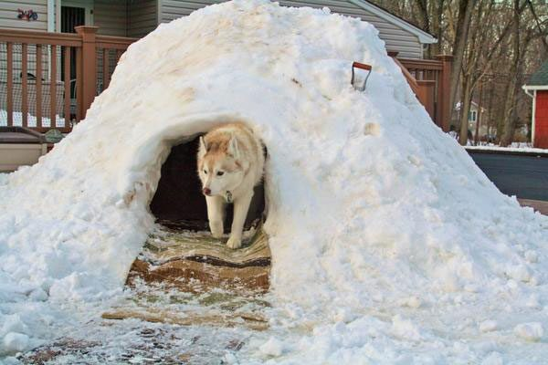 Поскольку сугроб в качестве "берлоги" хорошее решение разве что для северных ездовых пород, лучше заблаговременно позаботиться о теплом и непродуваемом собачьем доме.