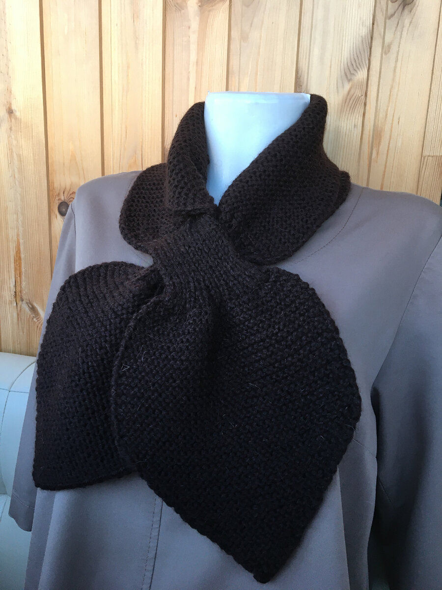 Пряжа – любая теплая: шерсть, полушерсть, меринос и т.д. Мой шарфик связан из пряжи «Наташа» Семеновская. Длина в мотке 200г. Вязала в 2 нити. Расход - 1,5 мотка. Если ваша пряжа с другим метражом, то тогда лучше ориентироваться на размер шарфика в сантиметрах. Спицы №4 Вязка платочная – все ряды лиц.п. В самых узких частях шарфика – резинка: 1 лиц., 1 изн. Кромочные: первую петлю снимаем, последнюю провязываем изнаночной. Набрать на спицы 3 петли. 1-й ряд: кром., накид, лиц.п., накид, кром. 2-й ряд: кром, все петли лиц. (накиды провязываем лиц. скрещеной), кром. 3-й и все нечетные ряды = 1 ряд 4-й и все четные ряды = 2 ряд Вяжем так до тех пор, пока ширина шарфика не достигнет 37 петель (считать вместе с кромочными). Затем 36 рядов вяжем прямо. Далее начинаем вывязывать деталь с отверстием. Для этого в следующем лицевом ряду вяжем по 2 п. вместе лиц. У меня осталось на спице 19 п. В изнаночном ряду провязываем 1 лиц., 1 изн. Не забываем про кромочные петли. Всего резинкой 1х1