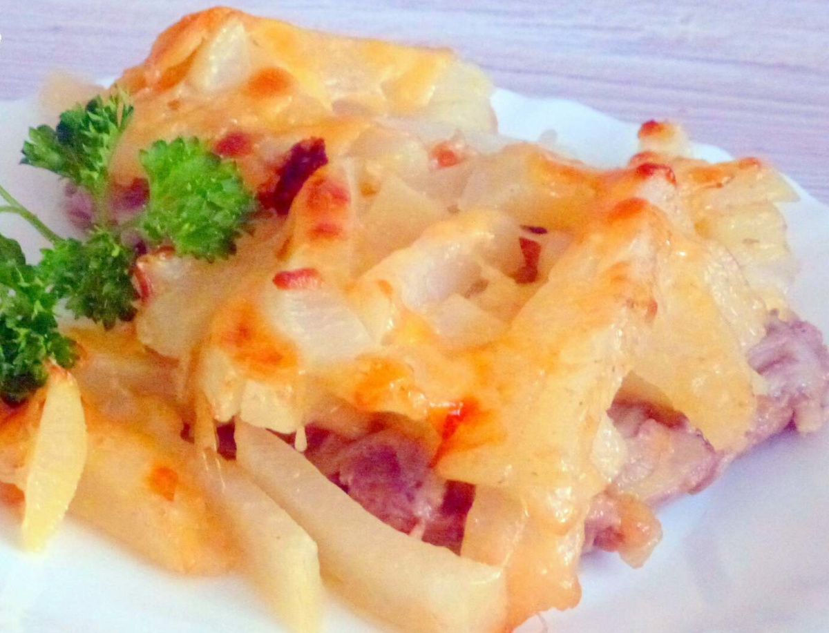 Лук нарезать соломкой, на минимальном количестве масла обжарить до золотистого цвета , остудить и выложить на мясо (очень вкусно,когда лука много ) .