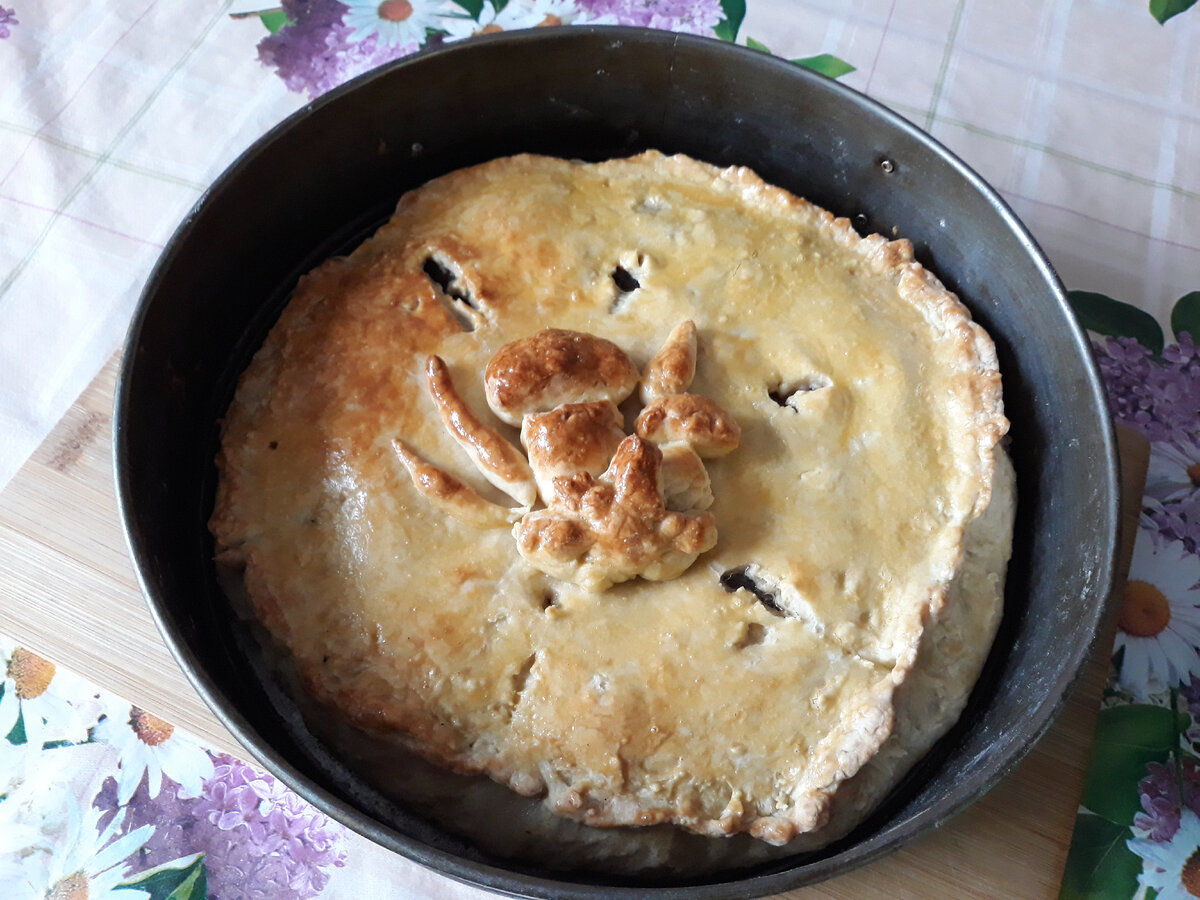 Суббота началась с выпечки пирогов. 9 ноября (во вторник) у моего мужа случился День рождения, который, как обычно бывает, перешёл на субботу, 13-ое. За мои неполные 55 традиционные застолья с сельдью под шубой и мясом по-французски набили оскомину, поэтому я каждый год пытаюсь "съехать" то на роллах и суши, то уйти в кинопоход, или просто поваляться перед теликом при свечах. В этом году лично испекла "Наполеон" и два пирога с мясом для домашнего чаепития. Мужу такие #пироги очень нравятся, поэтому убила двух зайцев: угодила имениннику и накормила гостей. Самый вкусный пирог Дальше я обычно пишу "Как выглядит". Не будем отходить от традиции. Внешний вид Фотосессия случилась ещё до выемки пирога из формы, с пылу, с жару, так сказать. Придётся начать с конца — перед тем, как поставить пирог в духовку, я украсила его слепленными из теста грибочками и смазала взбитым желтком. Грибы дают знать, что в начинке не только мясо (свинина), но и обжаренные предварительно грибы (шампиньоны). Начин