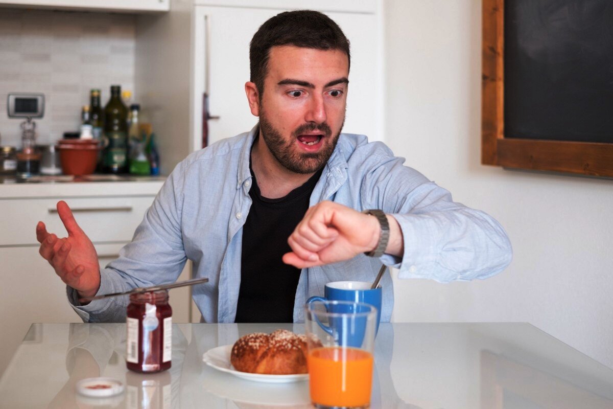 Никакого завтрака, затем быстрый обед и сытный ужин вечером. Кто из вас, дорогие мужчины, так питается? Нерегулярные приёмы пищи замедляют обмен веществ. Кроме того, организм вместо того, чтобы оптимально использовать предоставленные ему питательные вещества, будет хранить их в виде жировой ткани, потому что он никогда не знает, когда будет следующий прием пищи.
