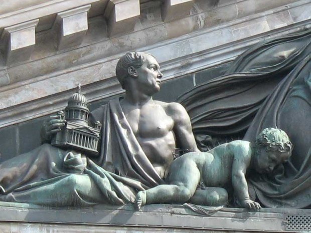 **** По одной из легенд, во время торжественного освящения собора, один из приближенных Александра II обратил внимание царя на скульптурную группу святых на фронтоне храма. В ней присутствовала скульптура самого Монферрана с моделью собора в руках