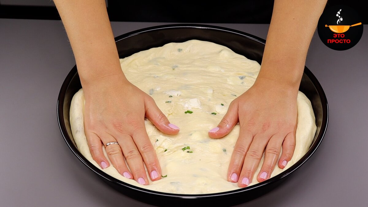 Теперь руками растягиваем тесто по всей поверхности формы. На пироге острым ножом делаем надрезы.