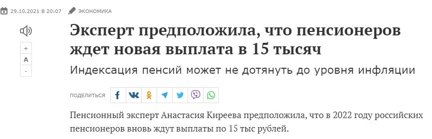 В бюджете Пенсионного фонда на 2022-2024 годы заложена индексация пенсий на уровне ниже официальной инфляции (например, в 2022 году пенсии проиндексируют на 5,9% при инфляции около 8%). Естественно, такое известие не встретило одобрения среди пенсионеров, поэтому для противовеса срочно были нужны какие-то позитивные новости для этой категории граждан. И вот они появились! В ряде федеральных СМИ опубликованы заметки с такими заголовками: Пенсионный эксперт Анастасия Киреева предположила (!), что пенсионеры могут получить еще одну единоразовую выплату в сумме 15 тыс. рублей после Нового года. Кто это? - спросил я у Яндекса и не нашел ничего, кроме того, что данный эксперт регулярно комментирует в СМИ все новости, так или иначе касающиеся пенсий и пенсионеров: Причем, как правило, она комментирует уже свершившиеся факты, а здесь делает прогноз, ну и довольно значимый для рядового пенсионера. Допустим, она, как говорится, "в теме", и что-то знает, чего не знаем мы. Открываем статью и читае