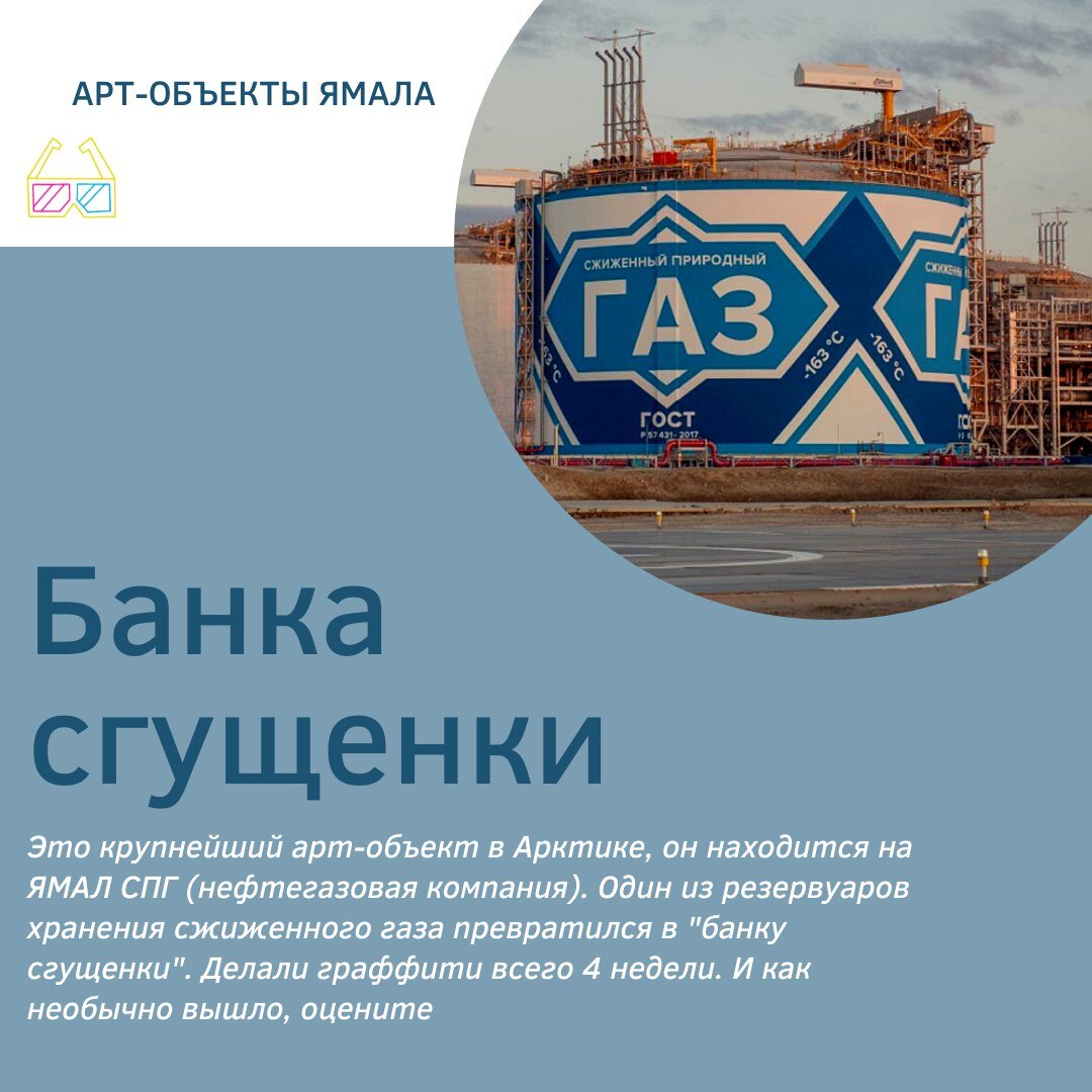 На Среднем или Южном Урале часто появляются арт-объекты. Екатеринбург даже называют столицей стрит-арта. А на Южном Урале есть целый город, который постепенно превращается в арт-объект - это Сатка. А есть ли какие-то необычные арт-объекты на крайнем севере? Расскажем, какие интересные объекты появились на Ямале. Как сжиженный газ превратили в сгущенное молоко Это самый крупный арт-объект на Ямале. Резервуар для хранения сжиженного газа внезапно, по задумке дизайнеров, превратился в банку сгущенки. Художники из компании ОЗ нанесли мурал всего за 4 недели, несмотря на то, что площадь краски была весьма внушительна - 10 500 кв.м. Как рабочие комара установили Автором скульптурной композиции, выполненной из списанных металлических деталей, стал местный скульптор Валерий Чалый, рабочие установили комара в сквере ветеранов в Ноябрьске. Комар - напоминание о ветеранах-первопроходцах, основавших город и окружающие поселки. Что за звездные сиги и почему они идут на север? Это новая для Салеха