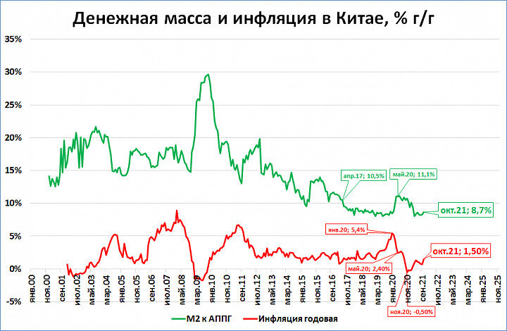 На 8,7% выросла денежная масса в Китае по итогам октября в годовом выражении. Инфляция за тот же период составила 1,5%, то есть в реальном выражении денежная масса тоже росла. С апреля 2021 года темпы роста реальной денежной массы (РДМ) сохраняются в узком диапазоне 7-8%. Выше речь шла о денежной массе М2. На просторах телеграма попалась такая картинка с темпами реальной М1: Надо будет позже найти данные и построить такой график ради интереса. P.S. Ориентироваться в моих статьях, заметках и видео удобно через НАВИГАТОР Раньше всего материалы публикуются в Дзен и Телеграм Телеграм : https://t.me/m2econ Дзен : https://zen.yandex.ru/m2econ Подписывайтесь! Буду благодарен вам за лайки и комментарии
