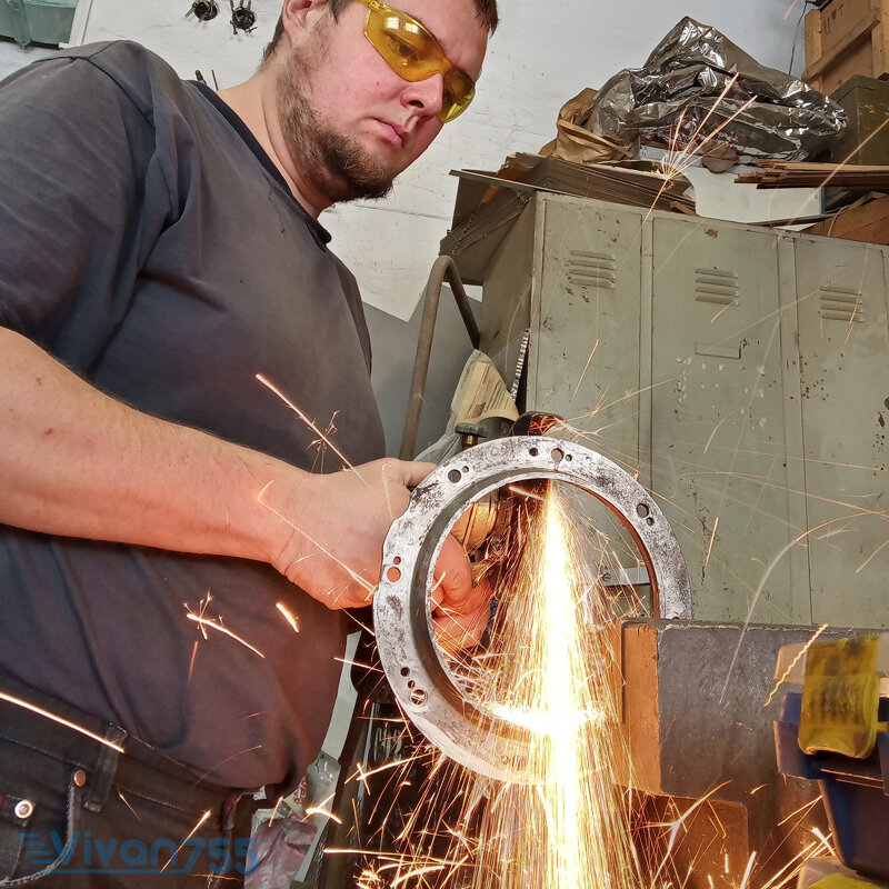 Обычно под диск угловой шлифмашины, в просторечии — болгарки, попадают различные стали — сплавы #железа . Всем знакомы снопы рыжих искр, бьющие при резке стали: Это частицы раскалённого металла, разлетаются они далеко и, попадая в препятствие, лежат и остывают. Поэтому они могут поджечь бумагу, тряпьё, дерево или разлитую ЛВЖ, что регулярно доводит до горя. Думаю, представляете последствия возгорания лужи масла в трюме корабля... Поэтому при резке стали обязательно надо с запасом учитывать разлёт искр, если надо — ставить заграждения. А что за деталь на фото? Это я режу крышку валопровода двигателя ТВ2-117, она уже покрашена и стоит на учебном двигателе: Вот сам двигатель, он ставится на старый #вертолёт Ми-8, который без буквы М: Об авиадвигателях — в другой раз, пока же о других сплавах — титановых. Титан используется в авиадвигателях благодаря своей лёгкости и прочности, но у него есть недостаток — в атмосфере #кислорода либо сжатого воздуха он горит как термит . Как горели титановы