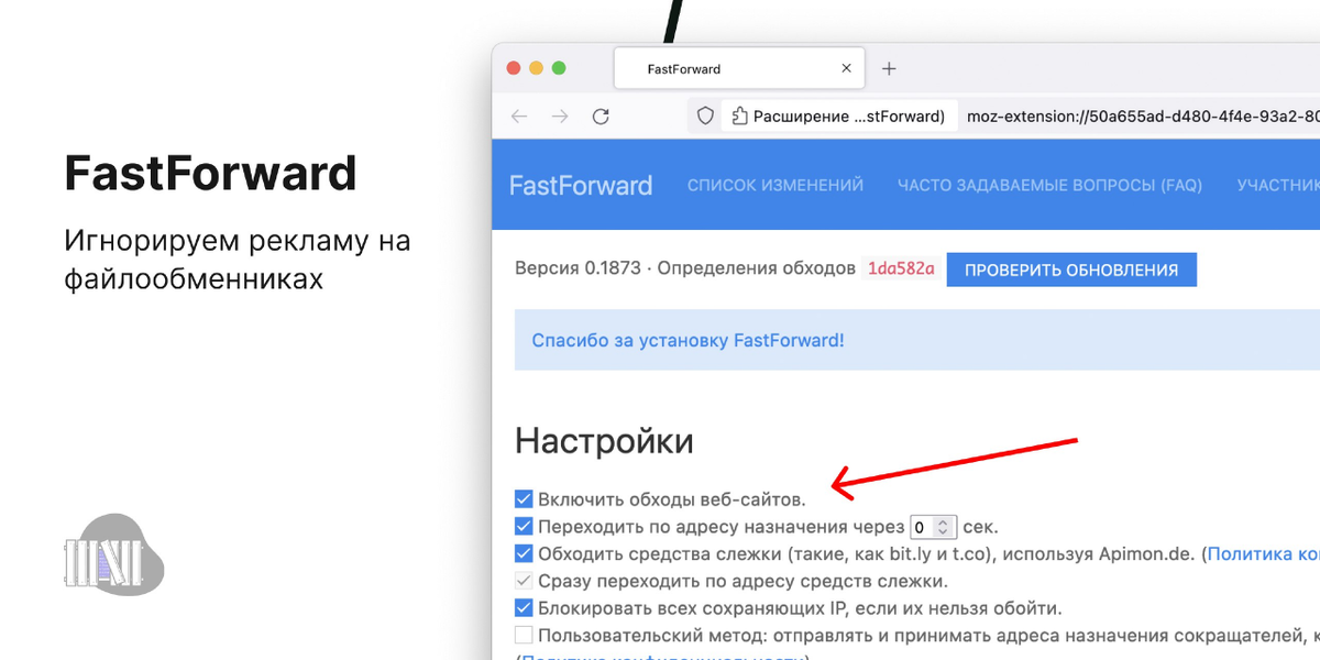 Когда вы загружаете любой файл с файлообменников, например, приложение или книгу — появляются ограничения и очень долгая реклама перед загрузкой. Обычно она длится больше минуты. Чтобы бесплатно отключить её, воспользуйтесь расширением FastForward . Оно пропускает ожидание и всю рекламу перед скачиванием файлов на любом файлообменнике. У плагина нет вирусов и прочих опасностей: это видно в открытом исходном коде проекта. FastForward доступен в магазинах расширений в Firefox и Edge. Если ваш браузер на основе Chromium — всё чуть посложнее. Для установки плагина открываем страницу GitHub , скачиваем и распаковываем ZIP-файл. После этого открываем страницу управления расширениями в Chrome и включаем «Режим разработчика». Нажимаем на «Загрузить распакованное расширение» и выбираем разархивированную папку. Готово! Теперь вы не увидите рекламу, когда будете скачивать файлы на обменниках.