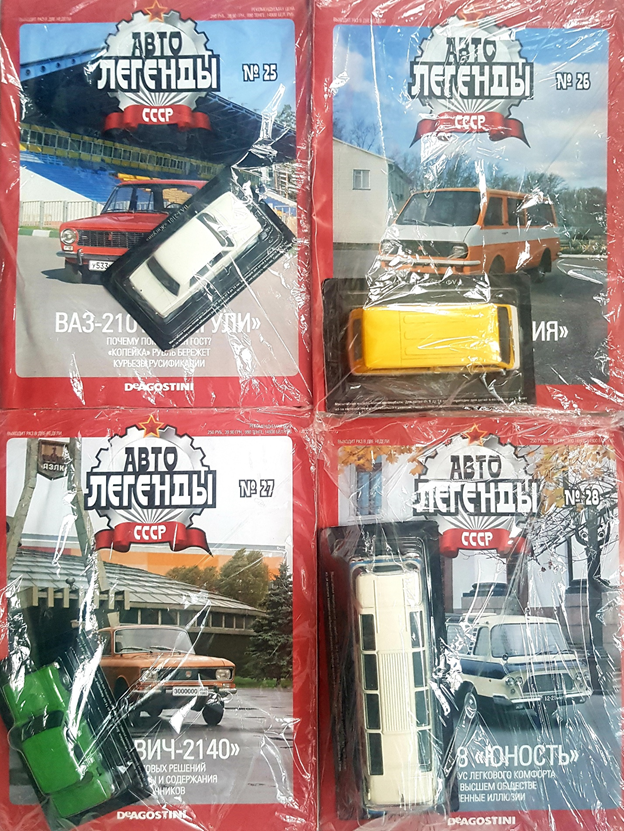 Сегодня возвращаемся в прошлое и «покупаем» выпуски: №25 (ВАЗ-2101 «Жигули»), №26 (РАФ-2203 «Латвия»), №27 (Москвич-2140) и №28 (ЗИЛ-118 «Юность»).