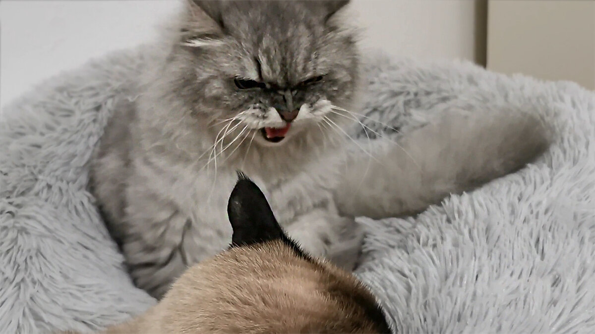 Я уже упоминала, что тайской кот Пупс имеет хитрую стратегию вылизывания своего конкурента с нагретого места. Зачем ему драться с тем же Финей, который больше и сильнее? И уж тем более, зачем вступать в битву с огромным Боней, если знать, что сразу проиграешь ему? Пупс обладает древней тайской хитростью: «Вылижи своего врага с места». Но можно не только вылизывать, но и уставиться в противника так, что он сам уйдёт. Но если он всё ещё раздумывает, то сделать вид, что случайно упал на краешек лежанки. Сидел, сидел, а потом бац и упал, коснувшись головой чужого места. И никаких драк! Соперник повержен без боя, он оставляет своё место и уходит. Если говорить о справедливости, то тут всё по-честному. Есть уговор, что Пупся спит в мохнатой шапке великанши ночью, а Финя весь день. Покупать вторую нет смысла, Финя непостоянен в своих вкусах. Решение находится быстро. Финику строю баррикаду, которую он любит, и ему больше не нужно волосатое гнездо. Персидский царь заселяется в хорошо укреплённ