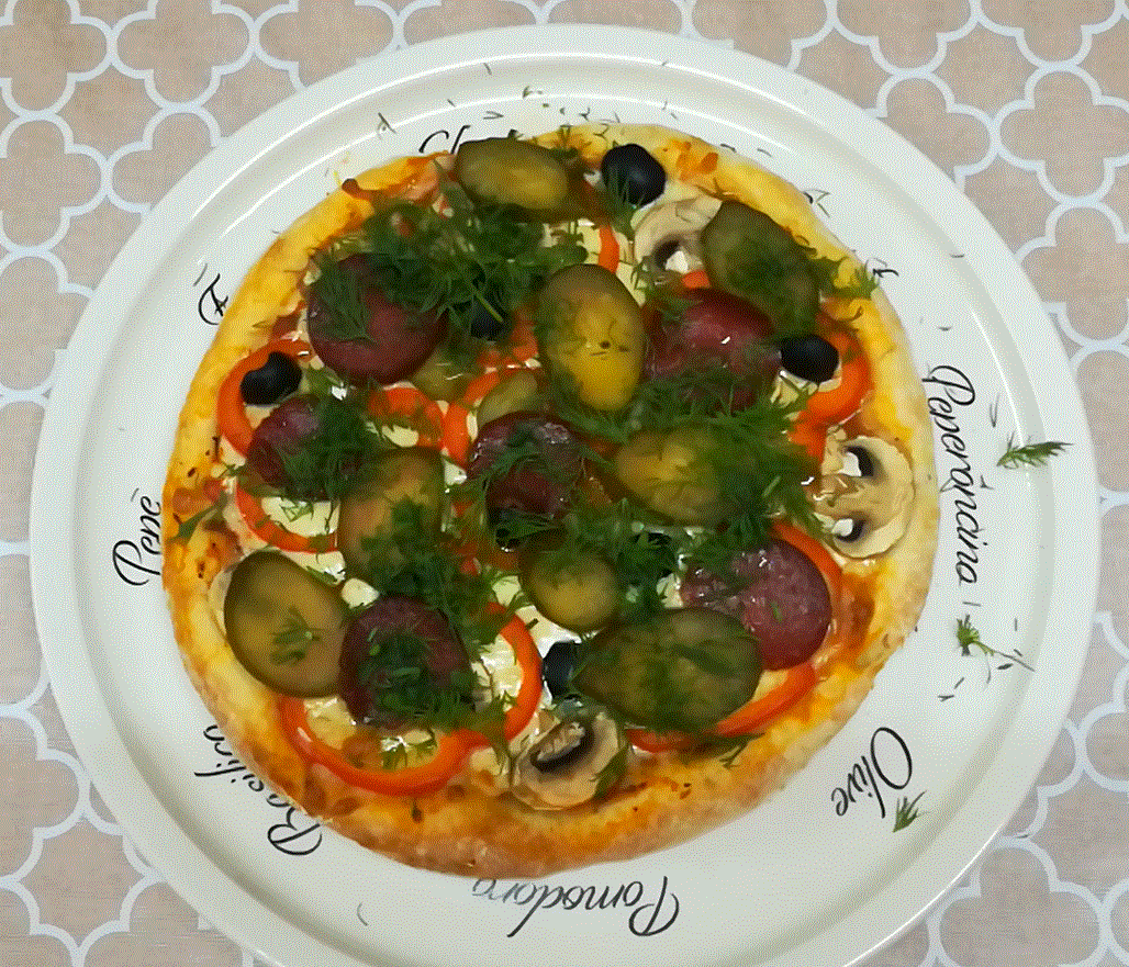 2-й вариант: уложила болгарский перец кольцами, слайсы шампиньонов, соленых огурцов (не маринованных), колбасы, половинки маслин. Готовую пиццу посыпала резанным укропом
