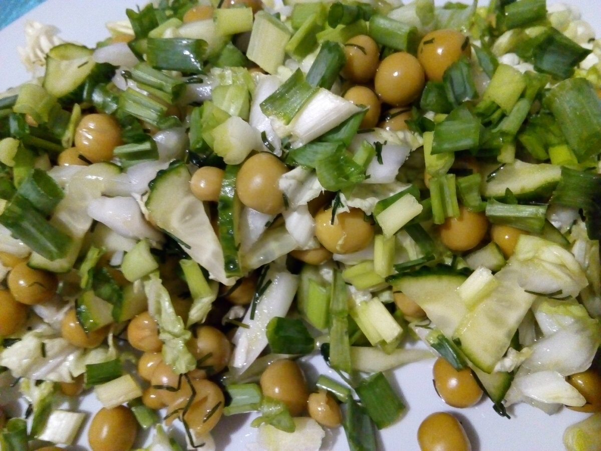 Готовить этот салат надо в сытом состоянии, в процессе приготовления пробовать нельзя! (Из личного печального опыта автора). Мне очень захотелось реализовать идею читательницы Людмилы (спасибо!). И результат мне очень понравился. Салат состоит из зелёных овощей и зелени. Шинкуем пекинскую капусту, немного солим, перетираем, режем свежий огурчик, добавляем немного укропа, зелёного лука. На одну порцию, по принципу "тарелки", овощной смеси должно быть 100-150 г для дам, 100-200 г для мужчин. Добавить консервированный зелёный горошек, это сложный углевод, на порцию берём 50-100 г, мужчинам можно увеличить порцию горошка до 130 г. Зелёный горошек относим к сложным углеводам, хоть это и овощ, потому что все термически обработанные овощи, фрукты или ягоды теряют в качестве своей клетчатке, т.е. теряют способность замедлять поступление глюкозы из пищи в кровь, характерное для сырых овощей, фруктов, ягод, в которых клетчатка "хорошего качества". К этому салату необходимо добавить третий компон