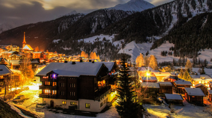Вечерний посёлок под горой.