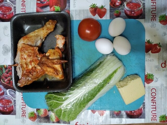 Долго думала что сделать на ужин. Решила сделать легкий, сытный и очень вкусный салат. Я думаю, что такой салат в самый раз подойдет и для Нового года. Когда на столе различных закусок очень много, а в желудке места уже нет. Но для вкусненького места же всегда найдется. Для сала я взяла такие продукты: 3 вареных яйца, Один средний помидор, Сыр – 100 - 150 гр. Пекинская капуста – пол кочана, Курица. Можно взять вареную или копченую. Все зависит от вкуса и возможностей. В этот раз я взяла курицу – гриль. Можно добавить зеленого лука. Я предлагаю добавить их каждому в свою тарелку. Дело в том, что, если вы не съедите весь салат, его придется убрать в холодильник. До следующего дня лук отдаст свою горечь, а пекинская капуста с благодарностью ее примет. За ночь салат даже в холодильнике станет горьким. А это уже не вкусно. Пекинскую капусту и курицу режем кубиками или соломкой. Яйца чистим, помидор моем. Все мелко крошим. Сыр натереть на крупной терке. Добавить 2 ложки майонеза, щепотка со