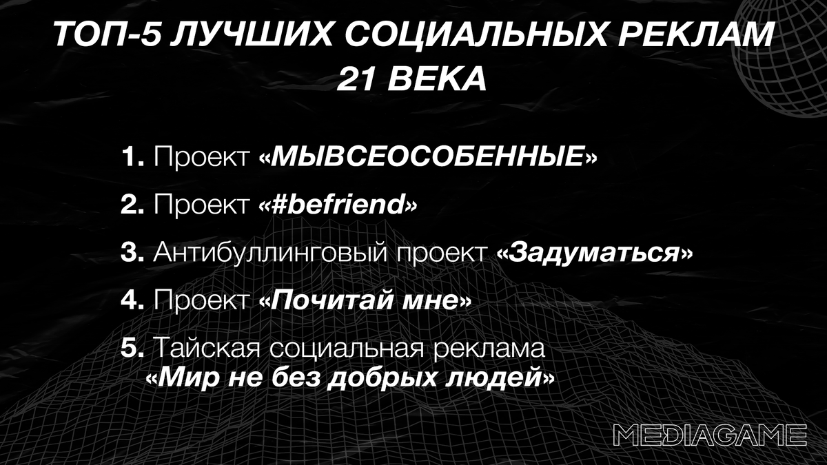 Социальная реклама заостряет внимание людей на общественно значимых проблемах. Как говорил Говард Госсадж, инноватор рекламного дела: «Реклама оправдывает свое существование, когда используется в общественных интересах. Это слишком мощный инструмент, чтобы использовать его исключительно в коммерческих целях». Цитата отлично описывает значение социальной рекламы: достучаться до сердца каждого человека и заставить задуматься. Создать успешную социальную рекламу помогает такое явление, как насмотренность. Это некая «творческая мышца», багаж креативных знаний. Представляем топ-5 примеров крутых социальных реклам 21 века, которые помогут прокачать насмотренность. 5 место. Тайская социальная реклама «Мир не без добрых людей» Эта реклама напоминает о круговороте добра в природе. Ее основная мысль - если делаешь хорошее дело, оно обязательно даст свои плоды и вернётся в геометрической прогрессии. 4 место. Проект «Почитай мне» Помните те детские годы, когда родители читали вам сказки? Мир казал