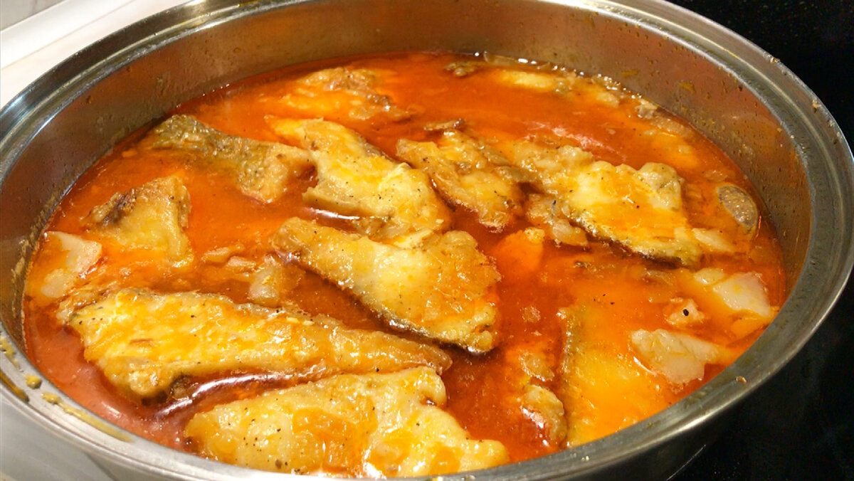 Здравствуйте. Сегодня буду готовить судака в подливке. Так можно готовить хек или минтай. Мама у меня заядлая рыбачка))), и когда наловит окуней, обязательно так их готовит. Очень вкусно получается. Лук нарезаю кубиками и обжариваю в небольшом количестве масла, до легкого золотистого цвета. Дальше добавляю муку и хорошо перемешиваю. Когда появится приятный аромат, похожий на жареный орех, добавляю томатную пасту. Томатную пасту обжариваю около минуты и добавляю воду. Добавляю соль и чёрный перец по вкусу. Тушу все 15-20 минут. За это время подготовлю рыбу. Вкусную закуску из рыбы на праздничный стол, можно посмотреть в этом видео: Рыбу нарезаю на небольшие кусочки, хорошо солю и оставляю на минут 5. Дальше рыбу обваливаю в муке, обжариваю до румяной корочки с двух сторон. Рыбу не нужно жарить до готовности, достаточно того, чтоб просто появилась корочка. Обжаренную рыбу опускаю в подливку. Если подливка не покрывает рыбу, доливаю немного кипятка. Готовлю рыбку на минимальном огне, п