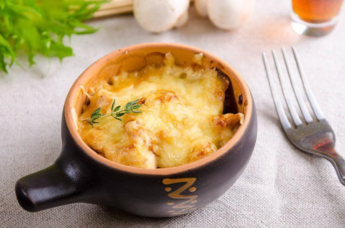 Второй вариант. Филе курицы зажарить в бумажном кульке, затем нарезать соломкой. Грибы, нарезанные соломкой, зажарить в масле, добавить филе курицы. Сметану и майонез смешать, добавить соль, сахар, лимонный сок, рубленый укроп и взбитое яйцо, залить этой смесью грибы и куриное филе и запечь в духовке.