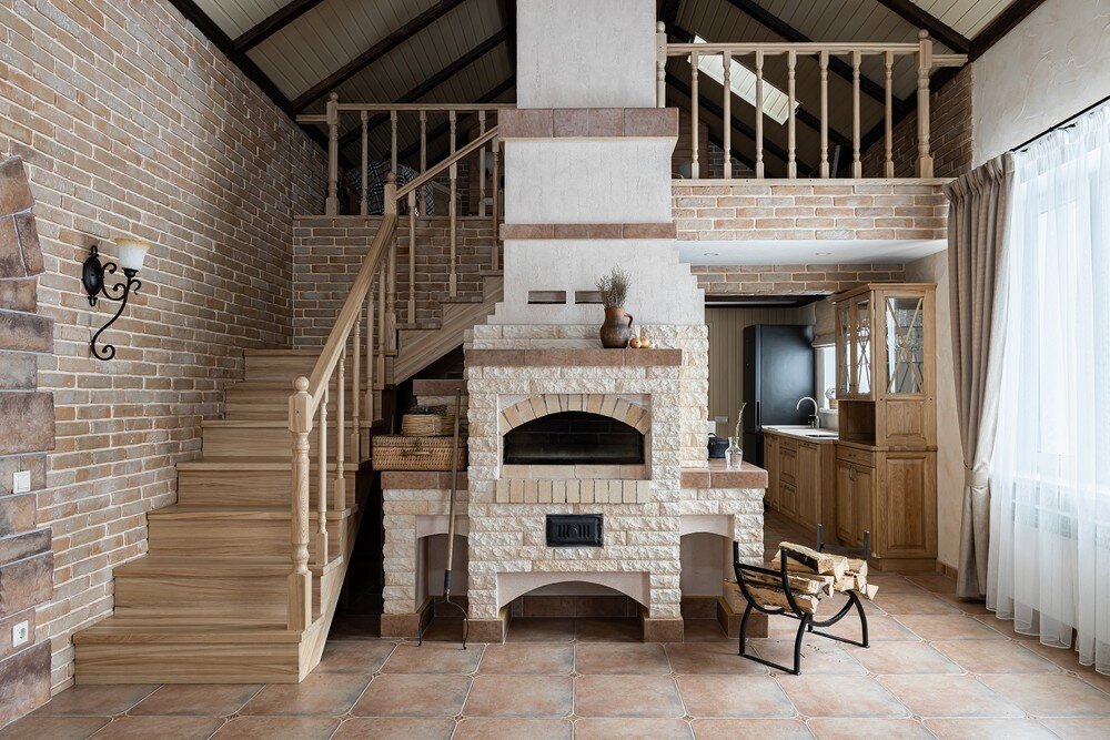 Автор проекта: Екатерина Зонова Фотограф: Иван Благушин Интерьер этого современного кирпичного дома пропитан запахом русской печки-камина, свежего хлеба и дерева. Герб на стене и печь символизирует преемственность поколений, уважение и благодарность к истокам. Благородные натуральные оттенки интерьера позволяют отдохнуть глазу от активного ритма жизни и ярких огней города. Высокие потолки создают ощущение свободы, простора и воздуха. Каменные стены создают чувство защищенности. Но сердцем этого дома по истине является камин-печь. Многофункциональный камин - печь разрабатывалась индивидуально по эскизам дизайнеров. В отделке сочетается декоративная штукатурка, гипсовый камень "Дикий камень" и керамогранит.