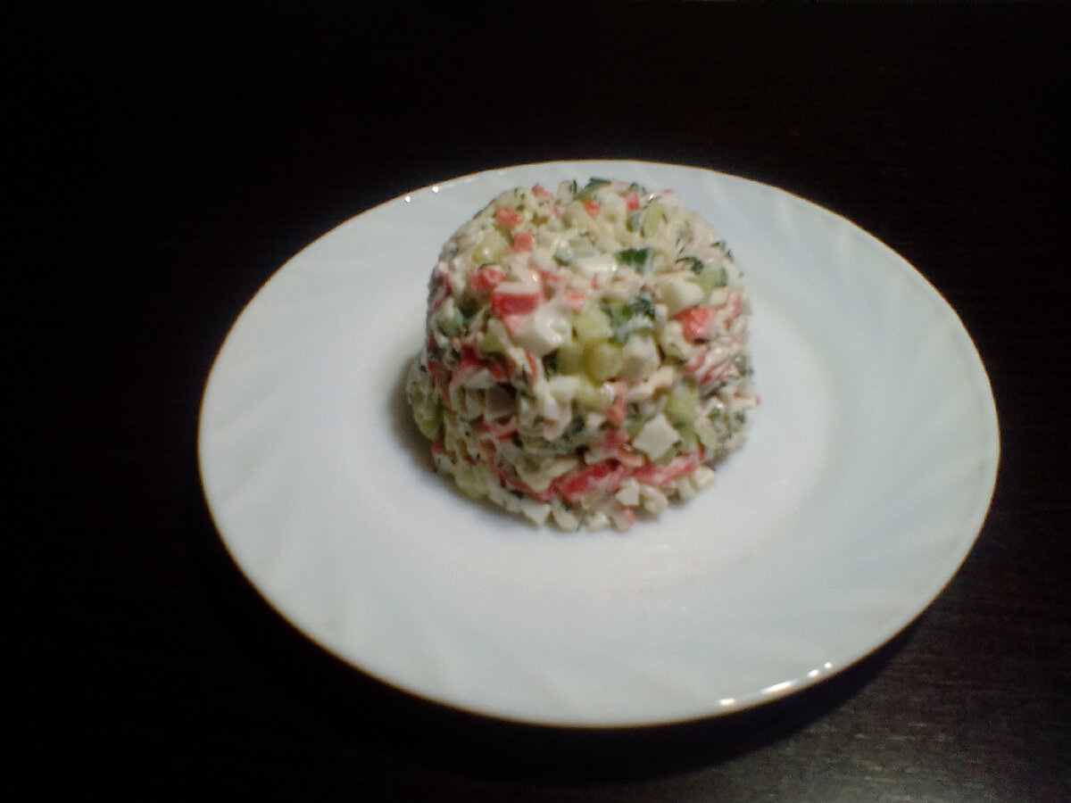 Довольно необычный салат с лапшой быстрого приготовления. Готовится быстро и просто. Получается сытный и калорийный. Продукты: Лапша быстрого приготовления 1 упаковка (60 грамм). Крабовые палочки 200 грамм. Яйца вареные 2 штуки. Огурец свежий 100 грамм. Укроп 20 грамм. Сметана 15% 40 грамм. Майонез 40 грамм. Приготовление: Лапшу поломать руками. Смешать с майонезом и сметаной. Оставить для набухания. Крабовые палочки нарезать некрупными квадратиками. Яйца нарезать мелко или натереть на крупной терке. Огурец нарезать мелкими кубиками. Укроп измельчить. Все ингредиенты соединить и тщательно перемешать. Убрать в холодильник на полчаса-час. И можно подавать. Из указанного количества продуктов получается 4-5 порций. Калорийность на 100 грамм 179 ккал. Б/ Ж/ У - 6,5/ 10,2/ 13,5. Другие рецепты: Салат с крабовыми палочками и яблоком. Легкий салат с крабовыми палочками. #крабовый салат #еда #рецепты #кухня #рецепты для не умеющих готовить #простые рецепты