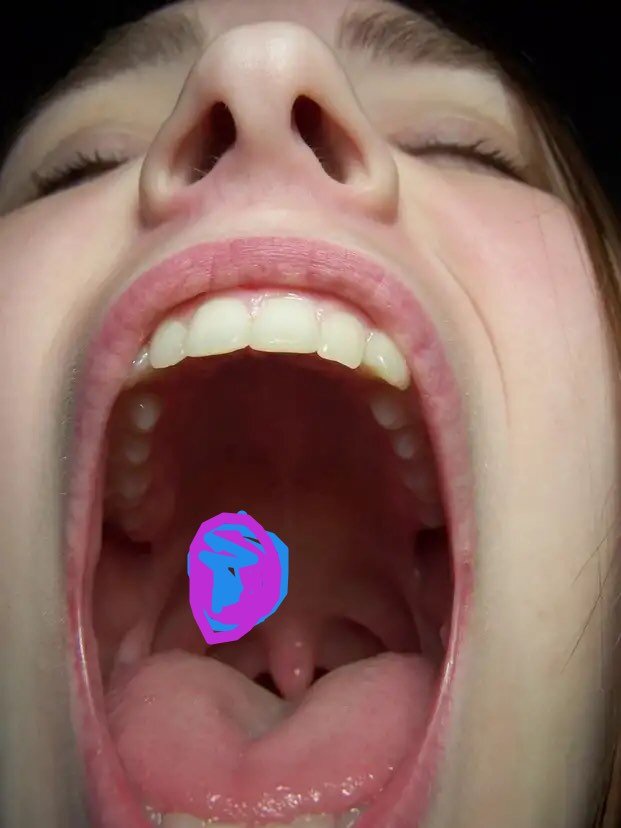 Всех приветствую, как и обещала рассказываю о том, как мне удаляли первый раз в жизни зуб мудрости. Начал доктор с самого простого, с верхней челюсти. Удаление действительно было не сложным, по времени это заняло минуты две, но когда на финишной прямой доктор тянул зуб, он выскользнул из инструмент эта и со всей силы отлетел мне в нёбо и упал под язык. Хорошо, что в горло не проскочил. Под анестезией мне показалось, что зуб просто слегка горло задел, но на деле все выглядело к вечеру примерно как на схеме ниже. Прошу прощения, не догадалась сфотать себя(( Но синяк был расположен вот прямо так и потом постепенно спускался ниже, было невозможно глотать, как при жёсткой ангине. Прошло это все буквально за три дня. И это самое лёгкое удаление зуба мудрости в моей жизни. Если вы ещё не читали мою историю удаления нижней 8-ки, то советую прочесть, надеюсь что будет полезно и интересно.