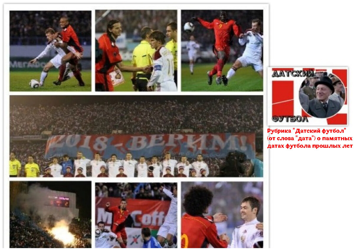 17 ноября 2010 Россия - Бельгия 0:2 (тов. матч). Воронеж Центральный стадион профсоюзов В том матче в Воронеже рождалась сегодняшняя Бельгия, ставшая командой №1 в рейтинге ФИФА. За них начинали Азар и Лукаку, а за нас Васин и Мамаев. На обложке фотографии того матча 2010 года и видим огромный баннер с надписью: "2018 - ВЕРИМ!" Дело в том, что матч проходил за две недели до объявления страны-хозяйки чемпионата мира в 2018 году, Россия была в кандидатах, также в кандидатах была Англия и совместные заявки Испания-Португалия, Бельгия-Голландия. Город Воронеж был в расширенном списке городов, которые приняли бы матчи чемпионата мира. В итоге через два года Воронеж не попадет в список 11 городов. Воронежский стадион вместимостью 34 тысячи впервые принимал главную сборную и встретил матч переполненными трибунами. В том 2010 году сборная России целый год провела под руководством нового тренера Дика Адвоката, который сменил Гуса Хиддинка после поражения в ноябре 2009 года в стыковом матч