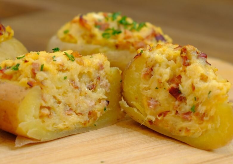 Картошка в духовке, запёченная по этому рецепту, подойдёт как основное блюдо и как гарнир. Готовится очень просто, а получается сытный и ароматный картофель в духовке, выглядит аппетитно, а пахнет просто умопомрачительно! Продукты (на 4 порции) Картофель большой - 4 шт. Бекон (или грудинка) - 120 г Лук репчатый - 1 шт. Сыр твёрдый - 70 г Масло сливочное - 20 г Соль - по вкусу Масло растительное (при необходимости) - для жарки Как приготовить фаршированный картофель, запечённый в духовке: