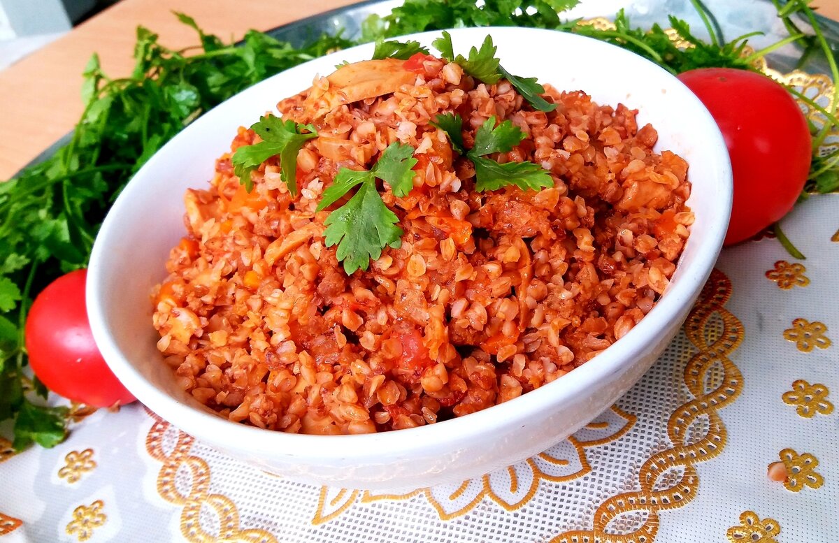 Продукты (на 7 порций) Гречневая крупа - 1 стакан Фарш мясной - 300 г Лук репчатый - 1 шт. Морковь - 1 шт. Чеснок - 2 зубкаП аста томатная - 2 ст. ложки Масло подсолнечное - 20 г Зелень по желанию Соль - по вкусу Как приготовить гречку по-купечески: 1. Гречку промыть. Смазать сковороду маслом (можно даже сливочным) и высыпать туда крупу, подсушить на среднем огне. 2. Натереть морковь, порезать лук (это можно делать во время "сушки" гречневой крупы). Обжарить в растительном масле до золотистого цвета. 3. Далее добавляем фарш, разбивая комочки. 4. И в конце добавить томатную пасту (или порезанные помидоры БЕЗ кожицы). Тщательно перемешать. И жарить на среднем огне минут 5 (пока фарш не потемнеет) 5. К мясу и овощам выложить гречку. 6. Залить кипятком так, чтобы гречка была слегка прикрыта водой. Посолить. 7. Тушить гречку по-купечески на медленном огне под крышкой, пока вода не испарится. Если гречка еще не готова, долить еще немного воды, повторить действия. 8. В готовую гречку по-купеч