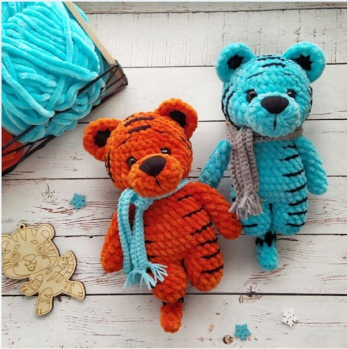 1. Пряжа Yarn Art Dolce или Himalaya Dolphin Baby (половина мотка). Я использовала Yarn Art Dolce 778 (кирпичный) и Himalaya Dolphin Baby 80315 (бирюзовый). 2 .Пряжа Alize Softy черного цвета для вышивания полосок. Можно вышить полоски любой другой пряжей на ваше усмотрение. 3. Черная нить для вышивания бровей и носа. Я использовала Alize Cotton Gold. 4. Любая полухлопковая пряжа для вязания шарфика. 5. Крючок 3.75 (или тот, который удобен вам для вязания из плюша). Крючок 2.5 для вязания шарфика. 6. Глазки 12мм. 7. Игла. 8. Холлофайбер. УСЛОВНЫЕ ОБОЗНАЧЕНИЯ: ВП- воздушная петля ПРИБ- прибавка СБН- столбик без накида УБ- убавка ПССН- полустолбик с накидом ПП- петля подъема Число в скобках в конце каждого ряда - это итоговое количество петель в ряду. Если за скобками есть знак умножения и число, это значит, что количество петель в скобках необходи