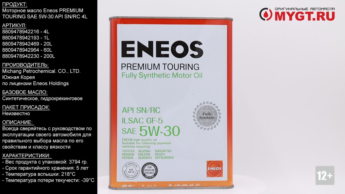 Продукт: Моторное масло Eneos PREMIUM TOURING SAE 5W-30 API SN/RC 4L Наш телефон: 8-800-550-57-22 ПН-ПТ 9.00-17.00 (МСК+4) Артикул: 8809478942216 - 4L 8809478942193 - 1L 8809478942469 - 20L 8809478942964 - 60L 8809478942230 - 200L Производитель: Michang Petrochemical. CO., LTD. Южная Корея по лицензии Eneos Holdings. Базовое масло: Синтетическое, гидрокрекинговое. Пакет присадок: Неизвестно Ссылка для покупки: https://mygt.ru/oil/eneos/ring-sn-5w-30-4-l.html Экологическое высококачественное моторное масло для четырехтактных бензиновых двигателей, в том числе для применения в автомобилях, оборудованных гибридной установкой, системой Start-Stop и турбонаддувом. Произведено на основе базовых масел наивысшей степени очистки. Благодаря применению технологий JX NIPPON OIL & ENERGY CORPORATION, Япония, имеет максимальную степень очистки от нежелательных примесей, обладает наивысшими физико-химическими характеристиками, устойчивостью к окислению, испаряемости, стабильности вязк
