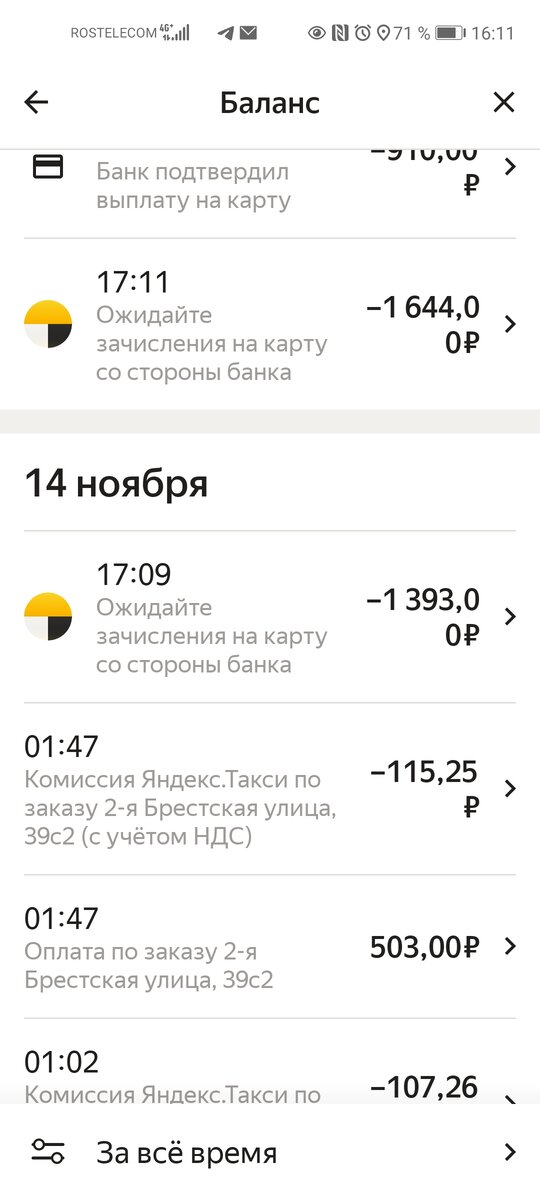Приветствую! Актуальный вопрос, на который я готов развёрнуто ответить. Итак, когда приходят деньги от яндекса? Всегда по-разному!) Шучу! На самом деле все просто. Есть определённые интервалы, когда приложение с вашего баланса отправляет средства банку. Средства за заказы выполненные до 22:00 придут на следующий день. А вот средства, полученные за заказы после 22:00 поступят через день. Знание интервалов позволит Вам подстроить свой график, в зависимости от финансовых нужд. Плюс ко всему в самом приложении Вы можете узнать, какая сумма была перечислена в банк и поступит в дальнейшем на карту. Чтобы увидеть информацию необходимо в своём профиле нажать на кнопку 'Баланс' : Собственно вот и все! Не переживайте, все заработанные средства будут перечислены Вам на карту. Тем кто хочет начать работать приятный бонус от меня в виде промокода: 966КОФЕ4 Удач на дорогах!