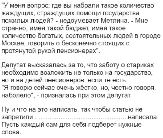 "Будем требовать от пенсионеров, чтобы их дети содержали родителей!" Грубо выразилась депутат Мосгордумы. Ответ других ошеломил