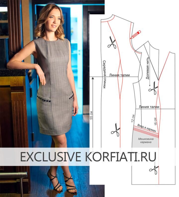 Элегантное облегающее платье в деловом стиле — одна из моделей must-have в гардеробе каждой бизнес-леди. И поскольку деловых платьев много не бывает, предлагаем вам смоделировать выкройку и сшить классическое платье-футляр, которое имеет сразу несколько интересных дизайнерских решений. Изящную архитектуру изделия длиной чуть выше колен создают плавные рельефные швы, начинающиеся от горловины. Карманы с подрезным бочком, декорированные узкими обтачками и обтяжными пуговицами, добавляют платью стильные акценты, а добротная натуральная шерсть в тонкую полоску как нельзя лучше подходит для этой модели. Великолепное решение для изящных женщин! Выкройка платья с подрезными карманами — в этом уроке.