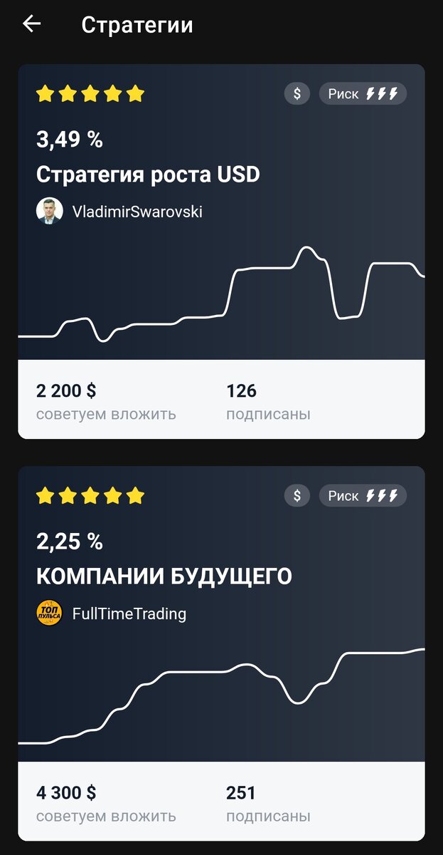 Уже рассказал своё мнение по поводу нового сервиса от Тинькофф с авто следованием. 💡Если коротко, то вы подписываетесь на выбранную вами стратегию и всё. Дальше начинается магия, всё покупки - продажи совершаются автоматически. Вам ничего делать не надо. Вроде бы неплохо, но возникает вопрос - а кто собственно управляет данным процессом? Насколько можно доверять данным людям и стратегиям? И самый главный вопрос: какая комиссия? Комиссия за это всё 0,33 процента в месяц и 20 процентов от дохода. 💡По мне так риск того не стоит, а комиссия вообще адская. Выгоден данный сервис брокеру, так как способствует увеличению покупок-продаж. Выгоден - автору стратегии. Вам же как участнику... Не уверен, что выгодно. Там кстати у авторов ещё можно посмотреть портфели в профилях, далеко не у всех они впечатляют. 💡Еще мне кажется, что данный подход будет заставлять рисковать авторов данных стратегий, чтобы заработать и собрать базу подписчиков.... Но это не точно. Риски высоки... Если вы з