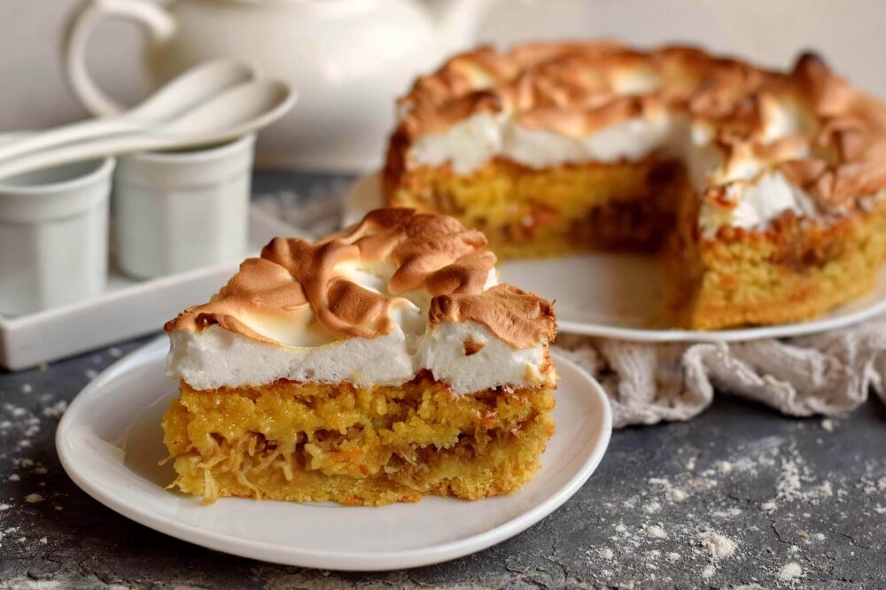 Рецепт вкусного пирога «Чебурашка», также его часто называются торт «Чебурашка», за счет изысканного внешнего вида. Сыпучее песочное тесто накладывается в форму в два слоя, в качестве прослойки используется яблочная стружка. Также начинку можно приготовить из других фруктов или ягод по вкусу. Сверху пирог украшается меренгой из яичных белков. Сладкое тесто отлично сочетается с кисло-сладкими яблоками и воздушной меренгой. Ингредиенты: Тесто-крошка: Начинка: Меренга: Ингредиенты: Сливочное масло заранее достаньте из холодильника, чтобы оно стало мягким. Аккуратно отделите белки от желтков. Желтки поместите в глубокую емкость, всыпьте сахар и щепотку соли. Добавьте немного лимонной цедры и ванильного сахара. Взбейте желтки с сахаром миксером в однородную смесь. Добавьте размягченное сливочное масло, еще раз взбейте, полностью растворяя масло в желтке. В отдельной емкости муку смешайте с разрыхлителем, просейте через сито. Муку соедините с основным составом. Сначала перемешайте смесь лож