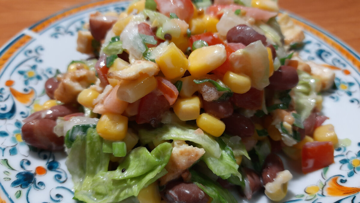 Салат с консервированной фасолью и кукурузой. Ингредиенты: Яйца 3 шт Пучок зеленого лука Помидор 1 шт Салат айсберг 60 г Консервированная фасоль 150 г Консервированная кукуруза 150 г Французская горчица 1ч.л Йогурт 100 г Соль по вкусу Приготовление: Яйца разбить в тарелку и взбить венчиком. Пожарить из яиц блин. Лук мелко порезать. Помидор порезать мелким кубиком. Блин порезать соломкой. Выложить в салатник. Добавить консервированную фасоль и кукурузу. Сюда же добавить французскую горчицу и йогурт. Всё посолить по вкусу. Хорошо всё перемешать. Приятного аппетита!