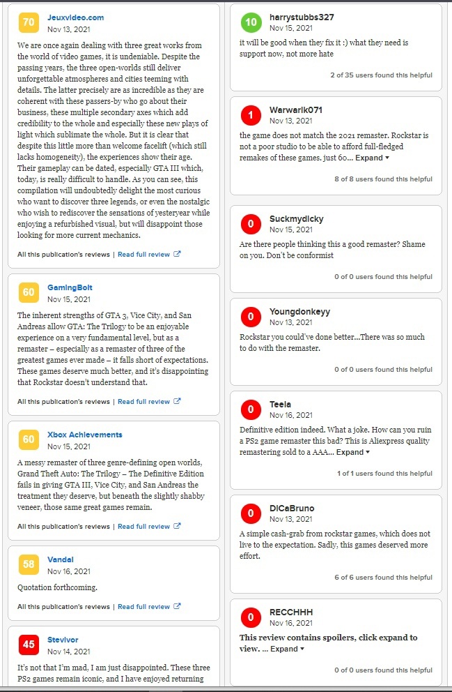 Вы наверно уже видели пару обзоров на Youtube или Вконтакте и видели этот стыд и срам от компании Rockstar. Все просто в недоумении как за такой большой ценник люди получают такой огрызок,а ведь цена очень приличная. Как всегда у рокстар проблема с их лаунчером:картинка,а также вылеты игры и на других игровых платформах: отзывы новой GTA Так почему же все считают игру провалом? Все очень просто люди просто не понимают как с бесплатными модами установленными на GTA San-Andres, игра выглядит куда лучше чем,то что анонсировали Rockstar. И все таки некоторым игрокам игра понравилась к примеру по отзывам с Metacritic:картинка, но по большей части это зарубежные пользователи,потому что у нас и не только,давно уже мододелы сделали моды для улучшения графики и моделей в той же GTA San-Andres. Графика в новой San-Andres Можно лишь добавить что GTA Vice city получилась атмосферной,но все равно немного мультяшной. Графика нового Vice-city Каков итог стоит ли тратить деньги и время на эту трилоги