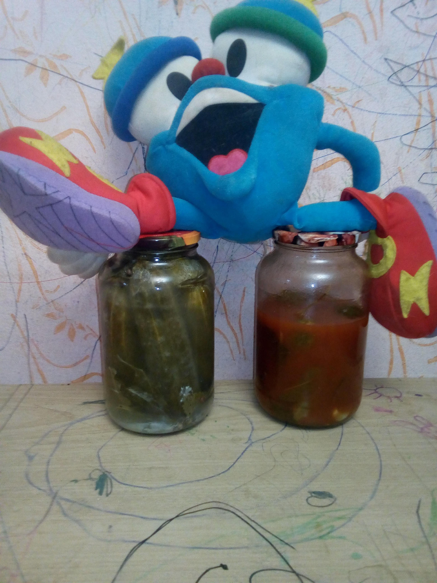 Обратите внмание на левую банку, она не вскрыта и есть осадок, который образовался при ферментации. Огурцы в этой банке хрустящие и с кислинкой, самое что я люблю, но после вскрытия окисление продолжается.