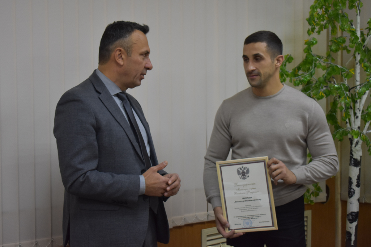 Благодарность Министра спорта Российской Федерации Олега Матыцина вручена тренеру по боксу «Спортивной школы «Мещера» Даниилу Махрову. Глава администрации Гусь-Хрустального района Алексей Кабенкин передал спортсмену заслуженную награду за существенный вклад в развитие отрасли физкультуры и спорта. Даниил Владимирович Махров – тренер по боксу высшей категории, Мастер спорта России. С 2016 года является сотрудником МБУ «Спортивная школа «Мещёра». Воспитанники Даниила Владимировича являются победителями и призёрами областных, всероссийских и международных соревнований. Четыре спортсмена под его руководством выполнили норматив кандидата в мастера спорта. Три боксера входят в состав сборной команды России в своих возрастных группах. «Вы даете нам множество поводов для гордости: благодаря Вам Гусь-Хрустальный район звучит не только в границах нашего региона, но и далеко за пределами Владимирской области. Вы своим ежедневным трудом помогаете добиваться успехов своим воспитанникам, прививаете