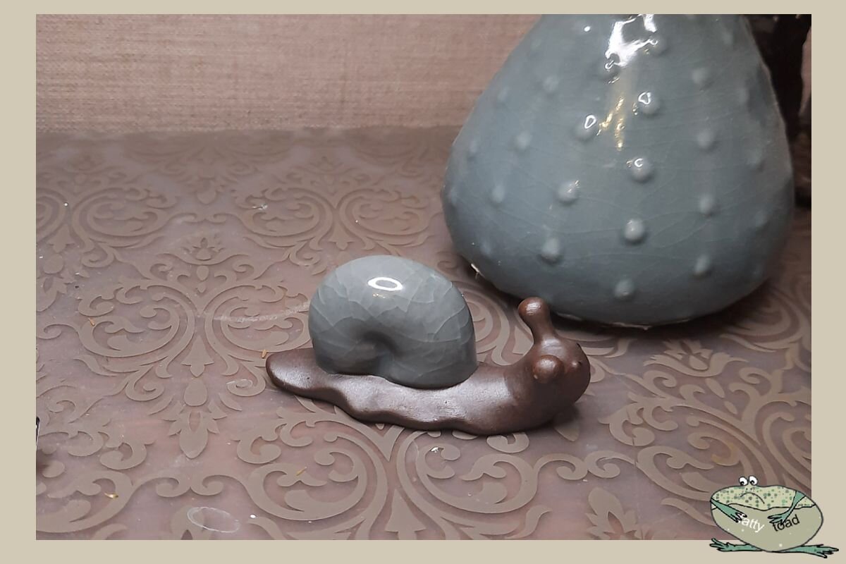 Недавно прибыли две улитки. И тут же подружились с остальными представителями своего семейства: Заказала я их лишь потому, что понравились. У меня есть дома вазы, около которых они должны были смотреться выгодно. Их две, тройная и одинарная. Им больше 20 лет. Тогда эффект паутинки, трещин только стал появляться, я в него влюбилась и люблю до сих пор, даже если не модно.