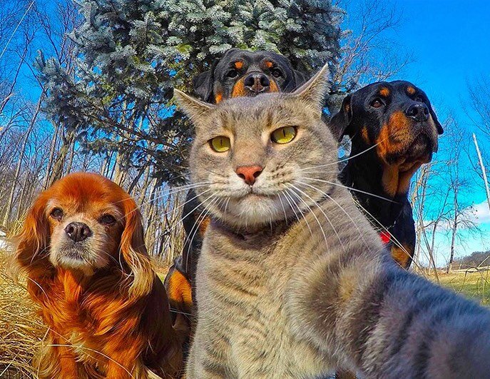 Четвероногий пушистик по кличке Мэнни, научился делать селфи случайно, когда его хозяин хотел запечатлеть его в забавной позе, котик протянул лапку к дисплею, тем самым сфотографировал сам себя. Йорем, владелец кота Мэнни, выложил фото в Instagram и в течении пары дней пост набрал более миллиона лайков. С тех пор кото-селфи от Мэнни стали настоящей сенсацией, а аккаунт @yoremahm имеет более 600 000 подписчиков. Когда-то Мэнни был бездомным котиком и повстречался своему нынешнему хозяину Йорему, после того, как умер его старый кот. И с тех самых пор они неразлучны. "Мэнни в восторге от камер GoPro, всякий раз, когда он хочет с кем-то сфотографироваться он протягивает лапку к камере, в результате чего получаются невероятно умилительный фотографии" - рассказывает Йорем. Особый восторг у подписчиков вызывают селфи с ротвейлерами, с которыми он подружился. Но у котика есть достаточно много фотографии с различными животными в их числе обезьянки, мыши и даже лев. Предлагаем взглянуть на неск